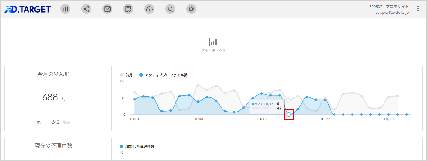 管理画面のアクティブプロファイル数のグラフで10月18日が0件で表示される不備が発生しているのでお知らせいたします。 ※この事象でのお客様への直接の影響はございません。